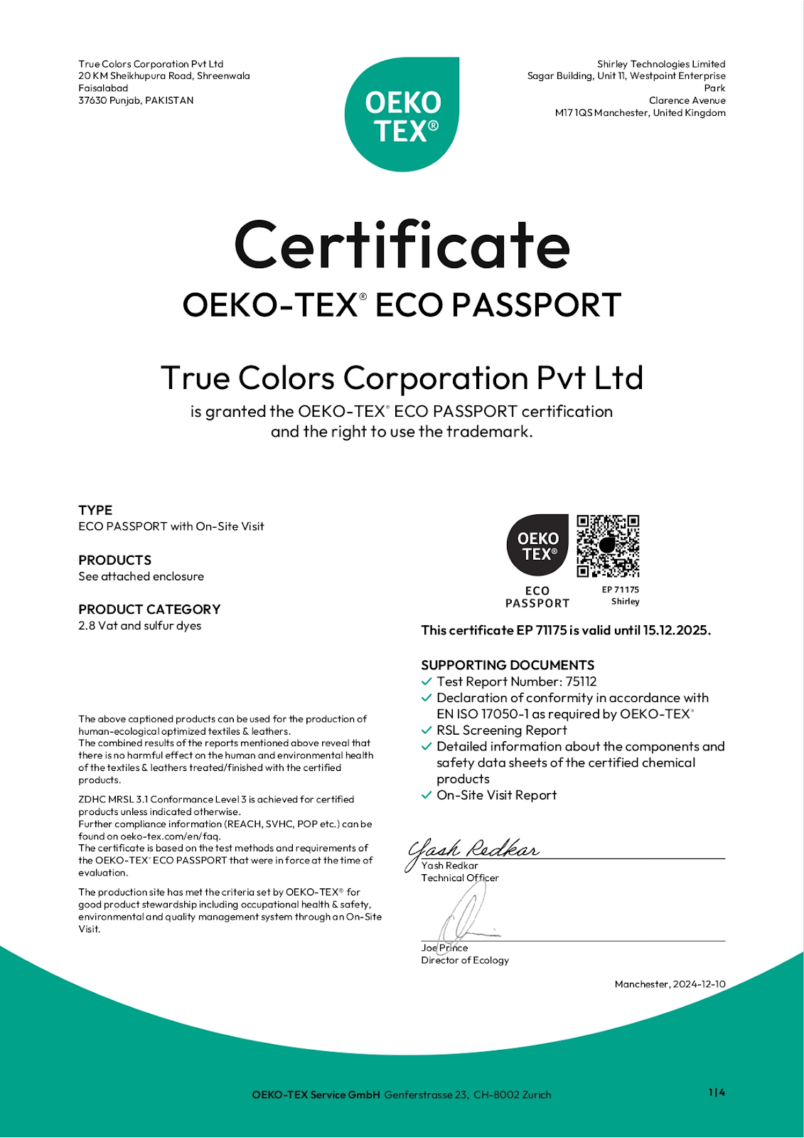 At True Colors Corporation, our commitment to safety, sustainability, and quality is backed by globally recognized certifications. From OEKO-TEX®, GOTS, and ZDHC Level 3 to SGS, REACH, and ISO 9001.